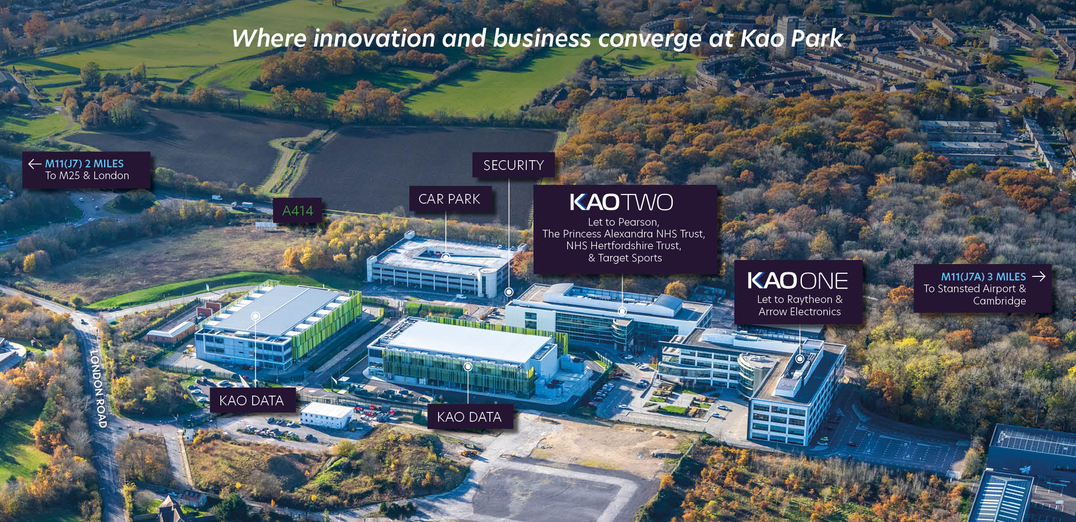 Located in the Harlow Enterprise Zone in Essex, Kao Park combines Grade A office accommodation and state-of-the-art data centres to create a unique proposition for occupiers seeking a next generation campus. With a long history of scientific and technological breakthroughs, including the momentous discovery of fibre optic cable, the site is the perfect location for any business looking to place itself firmly at the forefront of innovation.